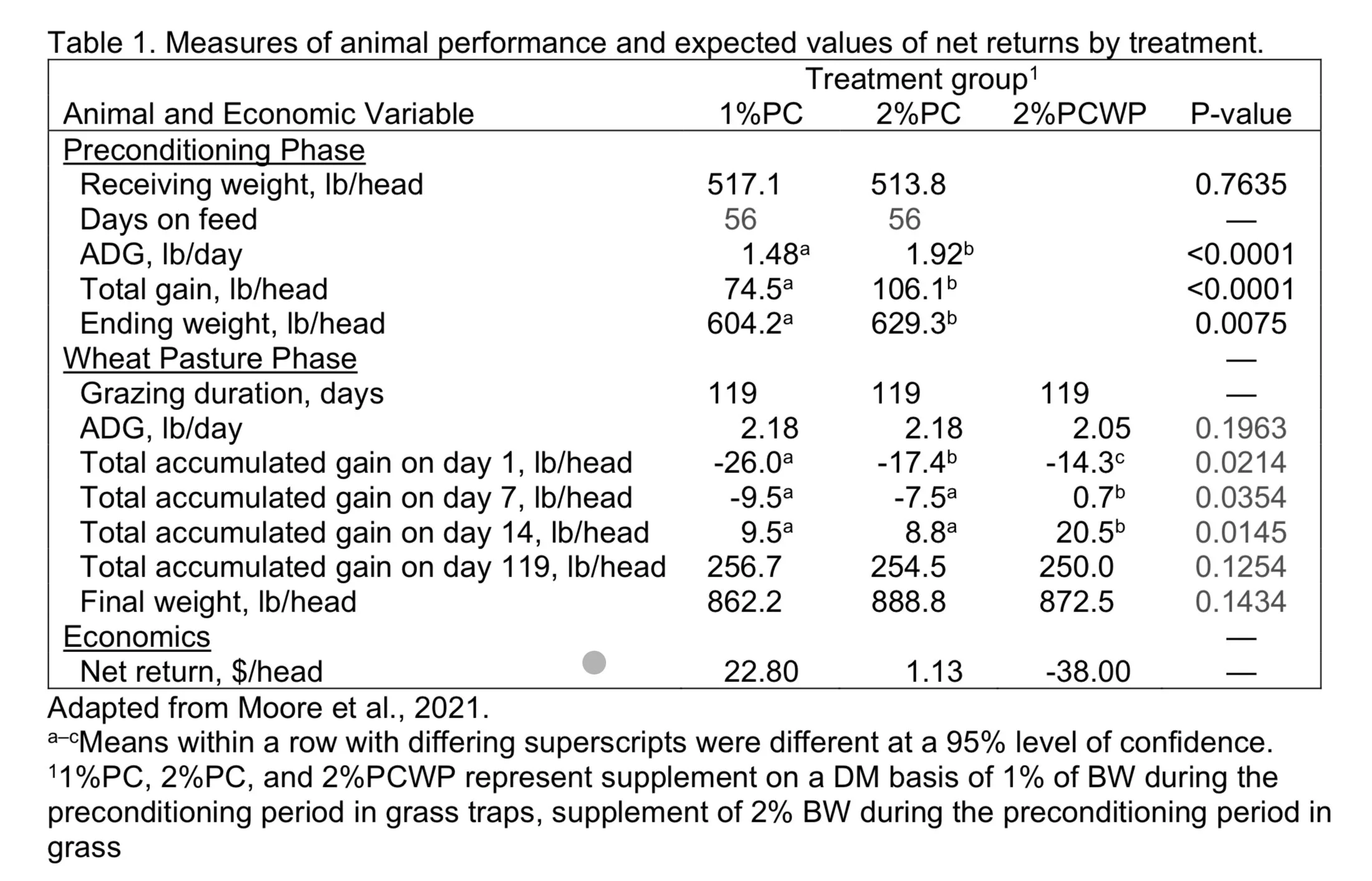 Research has shown that cattle transitioning to wheat pasture after preconditioning require an acclimation period before significant body weight (BW) gains occur.1, 2, 3 For example, 2003 Oklahoma research reported that calves grazing wheat pasture in central Oklahoma lost weight during the first 10 days of grazing, but by day 20, they recovered to their initial weight at the time of turnout.4