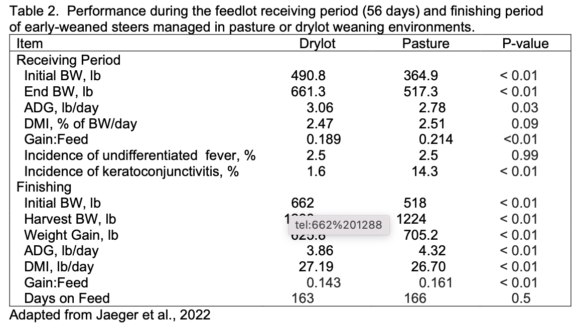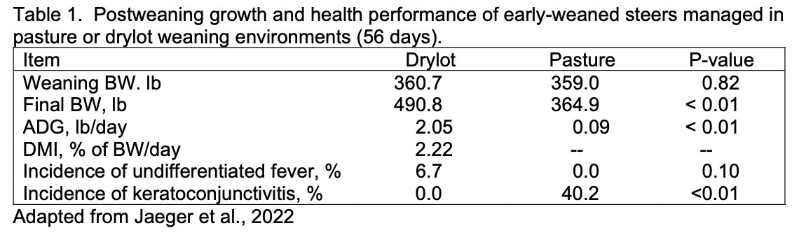 The effects of the weaning treatments on postweaning growth and health performance are shown in Table 1. As would be expected due to the difference in overall diet nutrient composition, BW after (491 vs. 365 lb) and ADG (2.05 vs. 0.09 lb/day) during the 56-day weaning period were greater (P < 0.01) for drylot than for pasture steers. The Incidence of undifferentiated fever tended to be greater (P = 0.10) in drylot steers than in pasture steers (6.7% and 0%, respectively). The Incidence of infectious bovine keratoconjunctivitis (i.e., pinkeye) was greater (P < 0.01) for pasture steers (40.2%) than for drylot steers (0%). These researchers suggested that the “late-season pasture conditions of the study, having an abundance of mature forage, likely presented a greater risk for corneal lesions than drylot conditions which ultimately led to a greater incidence of infectious bovine keratoconjunctivitis”.